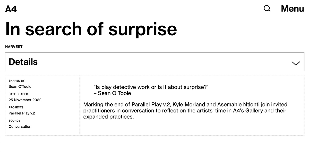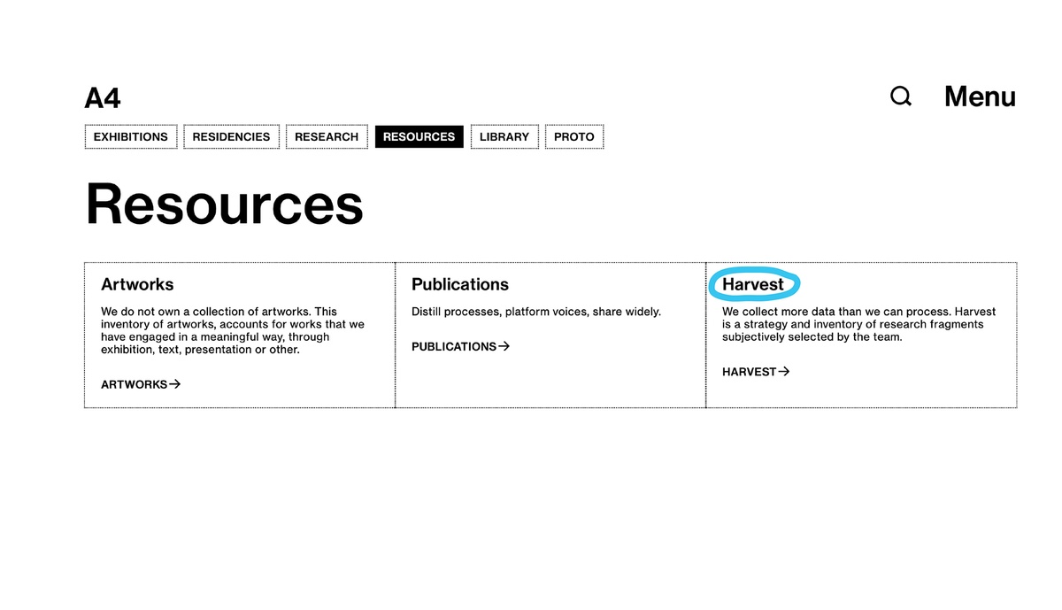 Harvest is a strategy and inventory of research fragments subjectively selected by the team that consists of passing thoughts, impressions and anecdotes gleaned from conversation and correspondence. As an idiosyncratic exercise, Harvest does not aspire to create an exhaustive or ‘complete’ archive but rather to encourage the subjective curiosity of the 'harvester', enabling the collection of compelling ideas from disparate sources. Compiled under this logic, unexpected interconnections and juxtapositions between seemingly unlike or unrelated things can surface. Entries are characterised by maker, sharer, tags, and source (conversation, correspondence, presentation, or publication). An accompanying text offers a brief framing of the entry’s provenance.