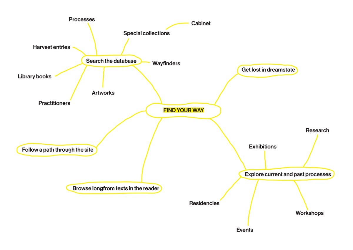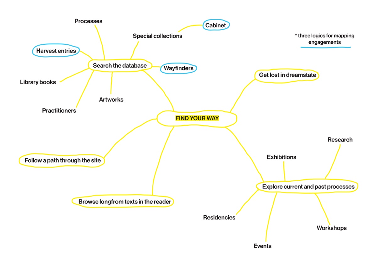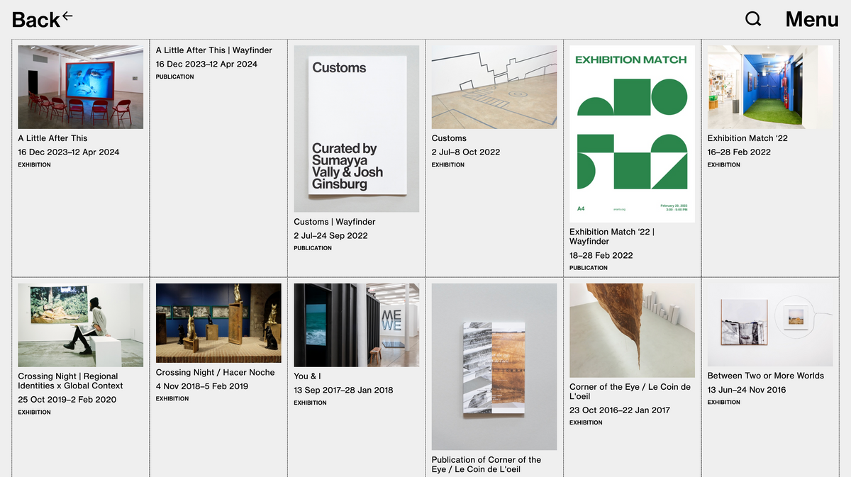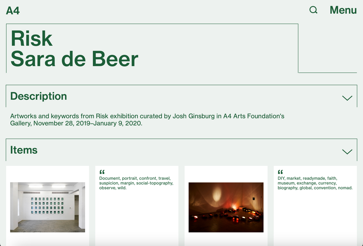 A series of modules on each project page draws together various entries from the database related to the process. For example: each exhibition page features a framing text, installation photographs, a map, a digital wayfinder, the works included, and related projects. Additional modules might express further readings, special collections, cabinet items, or harvest entries. These modules suggest different modes of engaging our content and alternative ways of moving through the database.