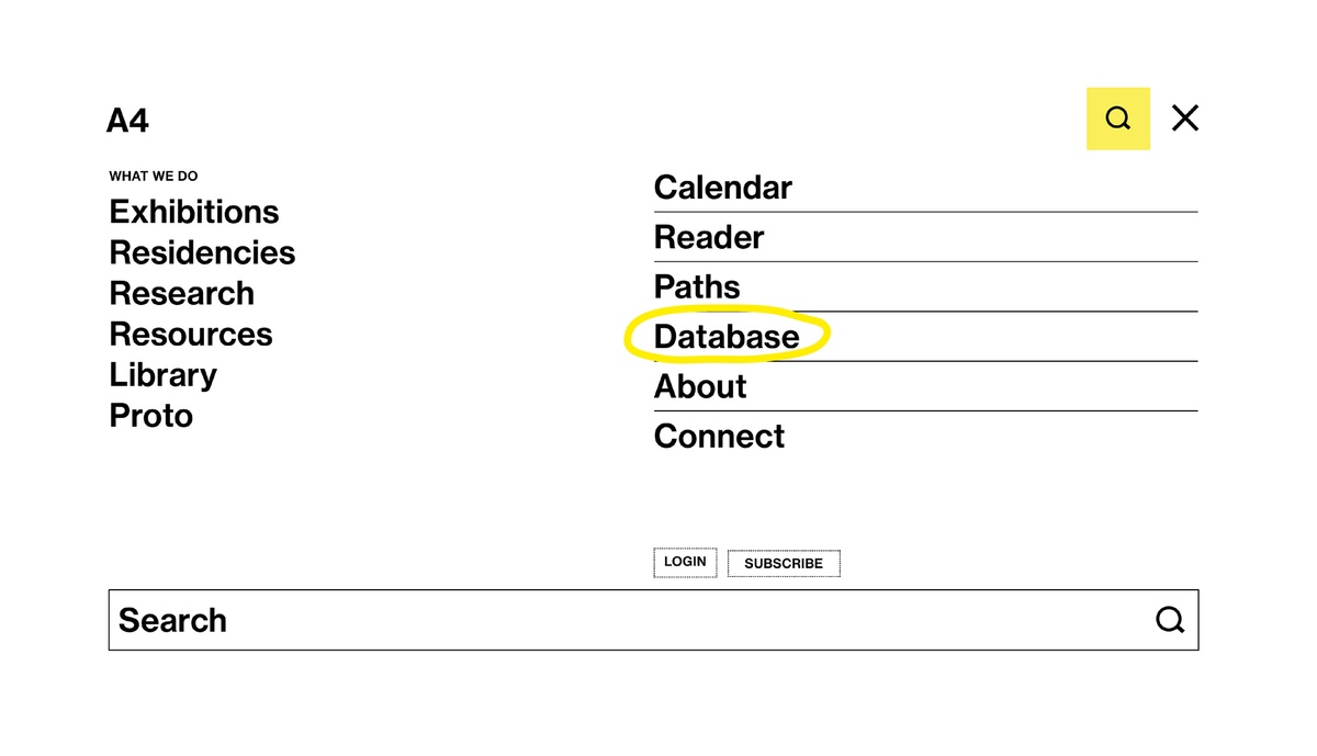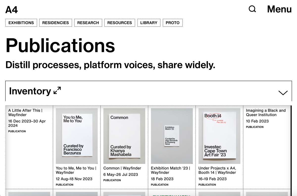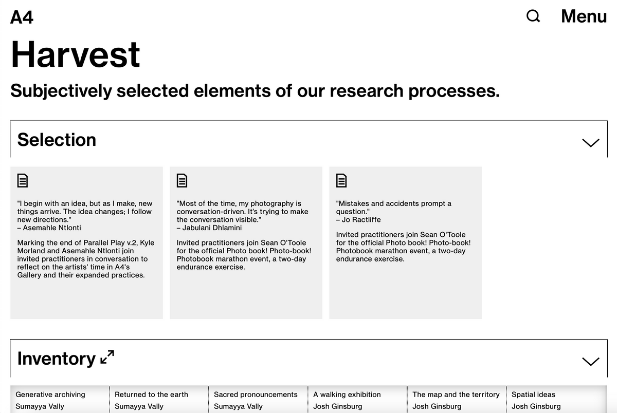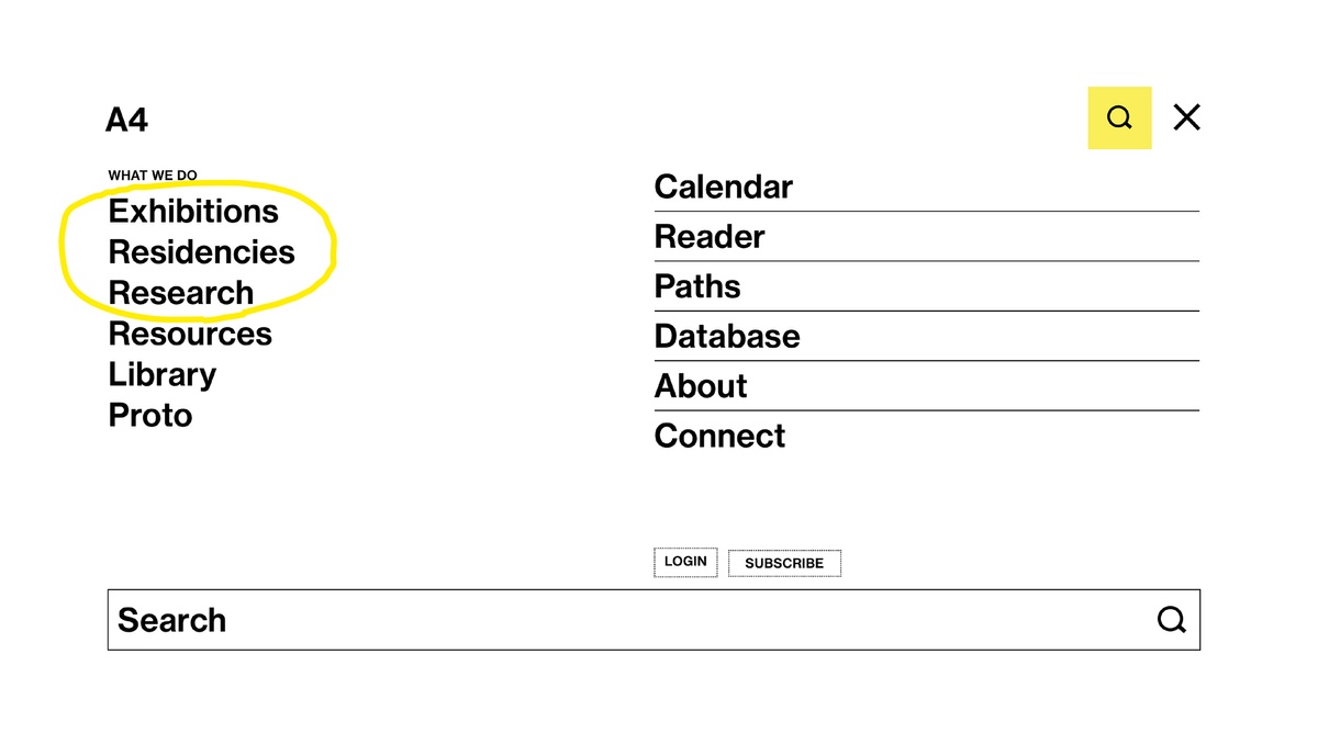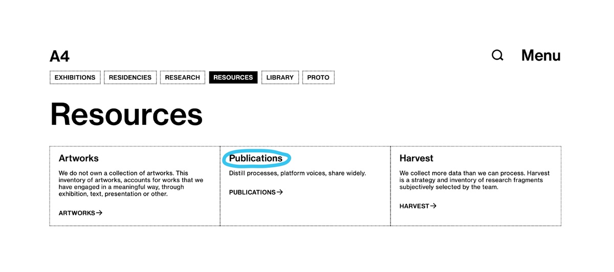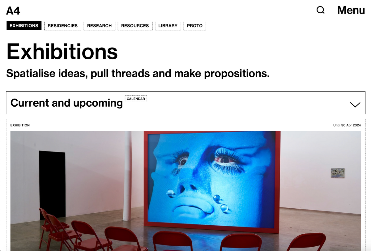 Arranged together under the heading ‘What we do’ are three processes central to A4’s programming: exhibitions, residencies, and research. Each associated page houses records for current and past projects, descriptions of the associated spaces in the building, and explanations of select programming components, such as Accelerator and Course of Enquiry. These categories offer straightforward engagement with our online content; a place to begin.