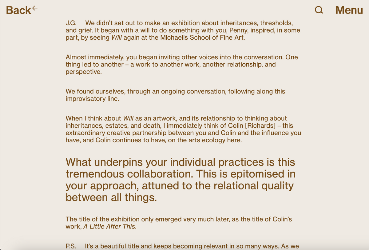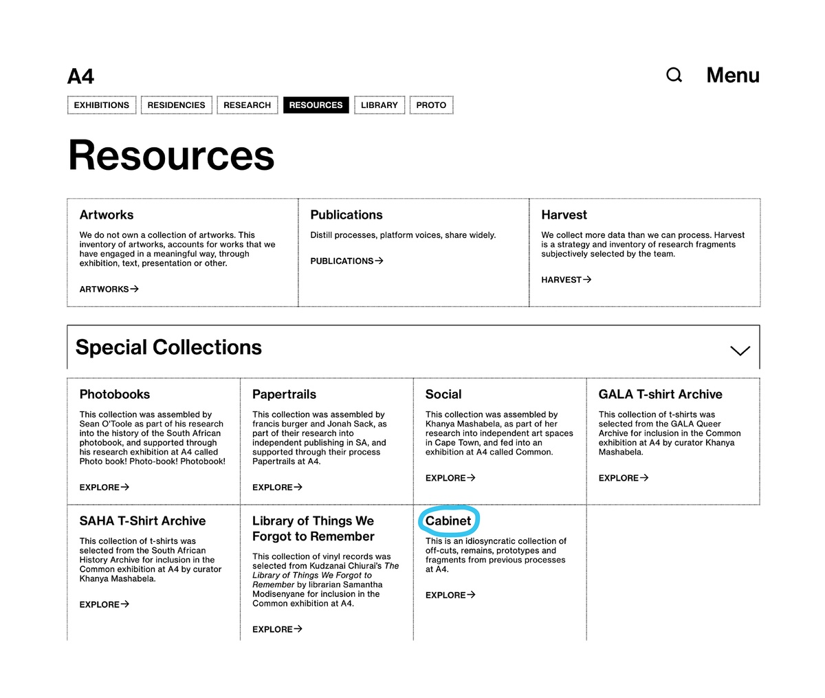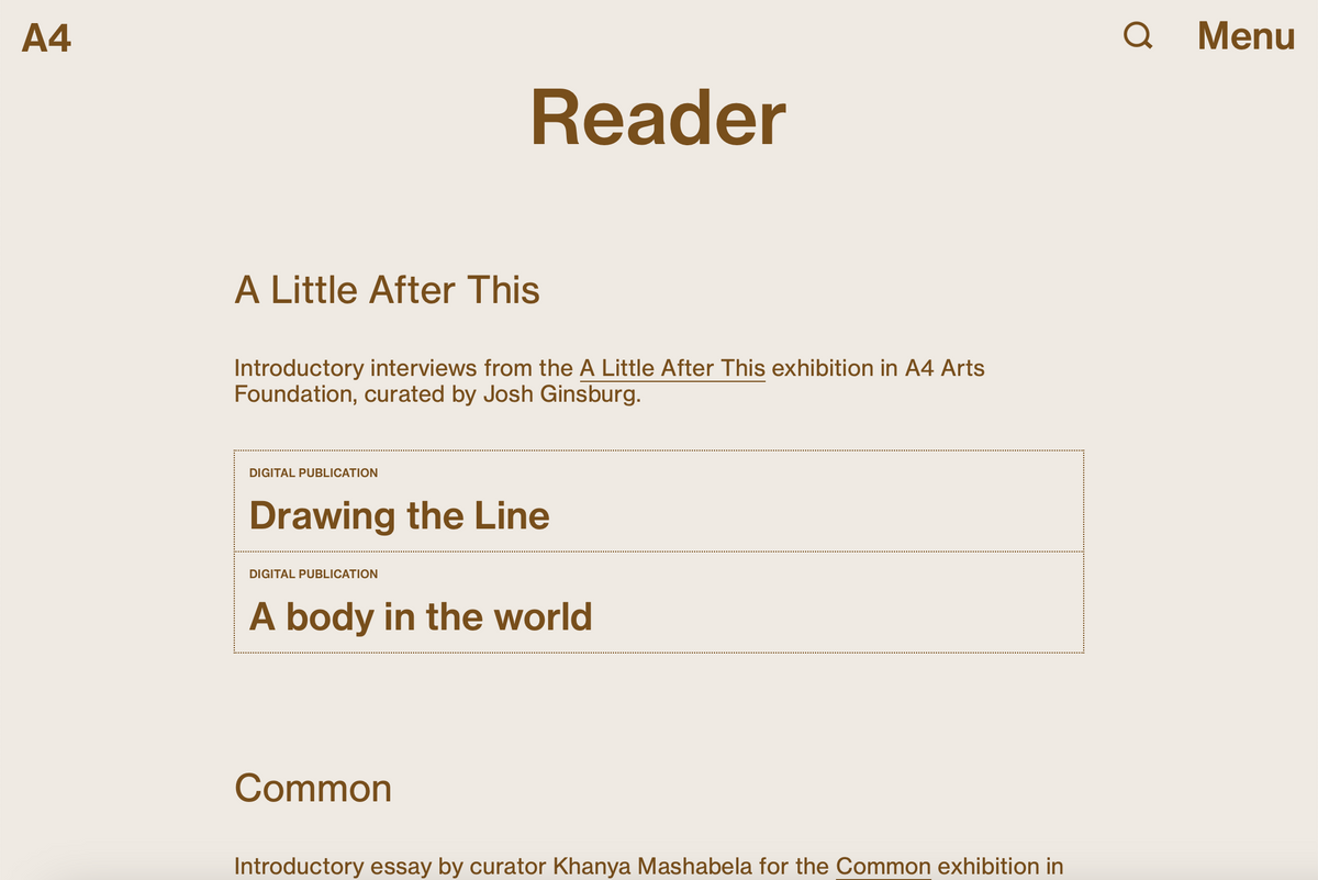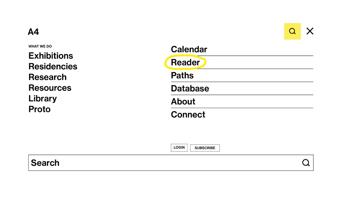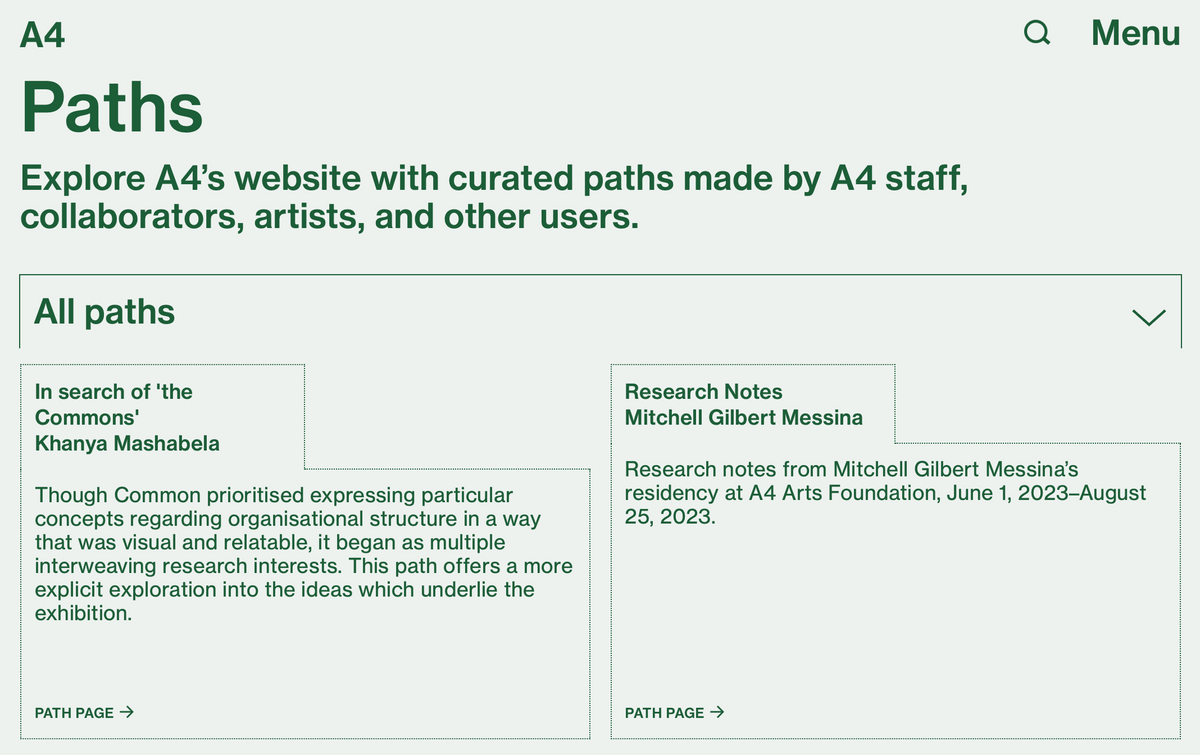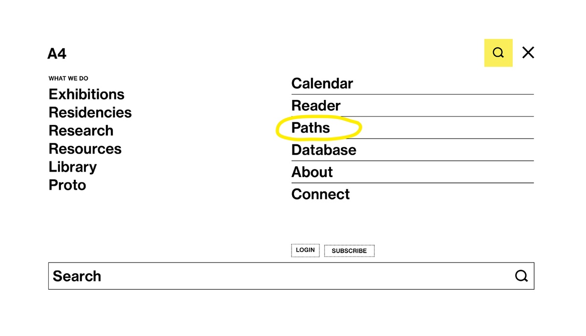 Arranged together under the heading ‘What we do’ are three processes central to A4’s programming: exhibitions, residencies, and research. Each associated page houses records for current and past projects, descriptions of the associated spaces in the building, and explanations of select programming components, such as Accelerator and Course of Enquiry. These categories offer straightforward engagement with our online content; a place to begin.