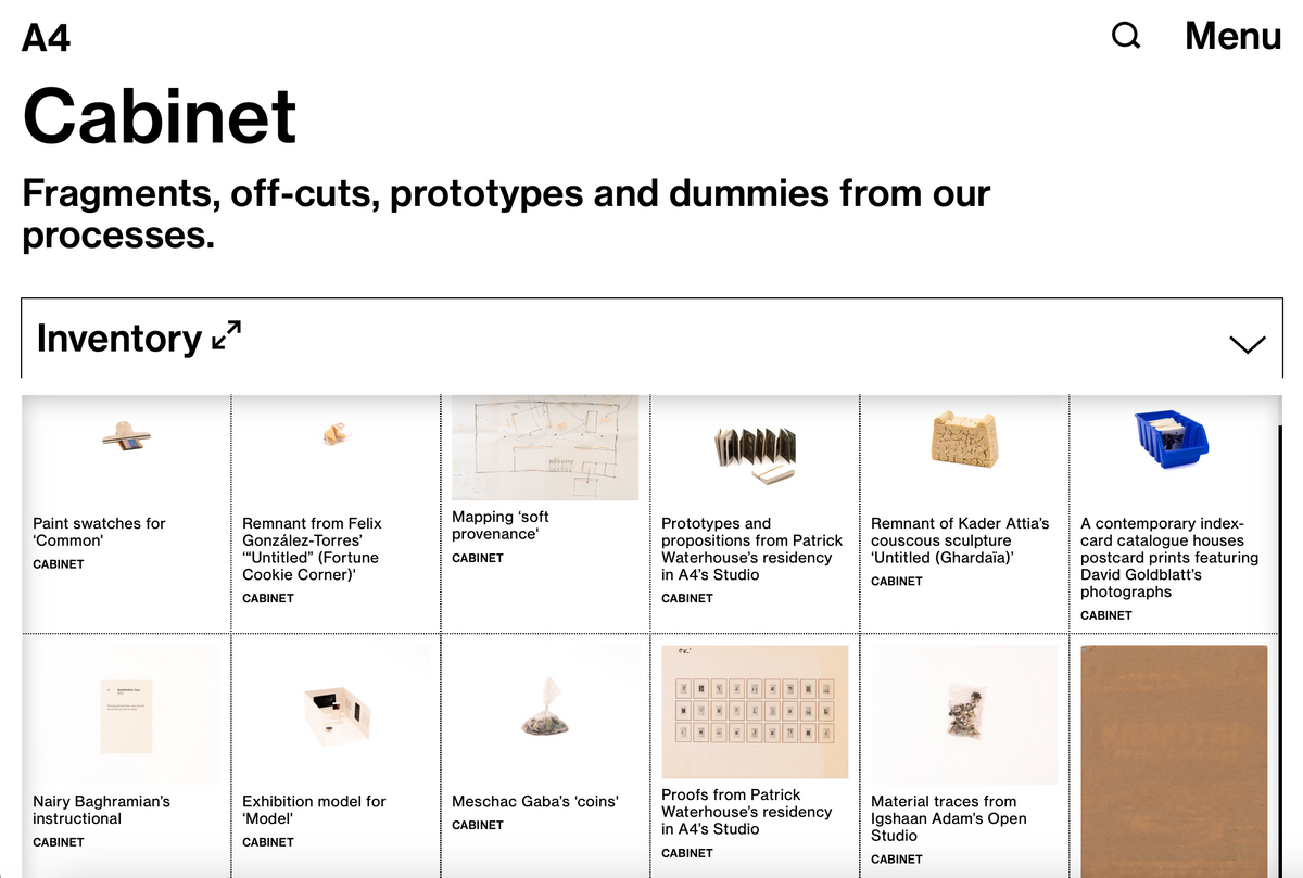 Cabinet describes the physical housing of objects adjacent to processes within A4’s building, and the means by which they are consigned. An artist’s pen, fragments, off-cuts, a note scribbled on paper; all such species of things find an archival home in the foundation’s Cabinet. Like Harvest, Cabinet is more incidental than comprehensive, and offers a collection of objects with particular resonance to each maker’s engagement with A4. For the time being, Cabinet has no single location – being a distributed archive across the building’s three floors. More legible examples of the exercise can be found on the About Wall on the ground floor, or in the online database.