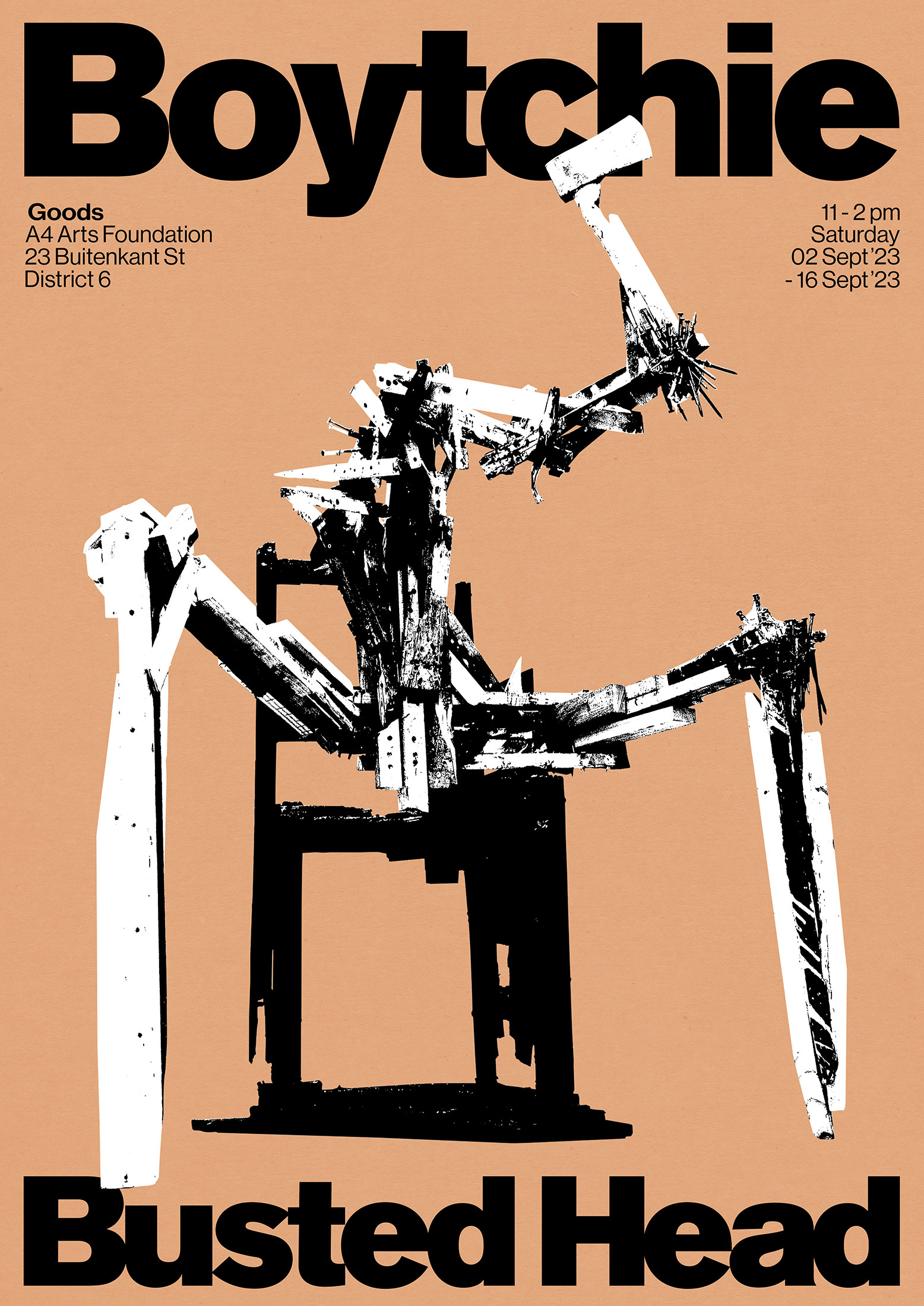 Boytchie (aka Phillip Newman) iterates and reiterates a sculptural installation centred around two specific found objects: a broken chair and an axe. In his initial engagement with these objects, Phillip found a compelling tension in their ability to evoke both aggression and fragility when combined. This tension, he suggests, reflects the public perceptions and inner emotional turmoil that characterise the experiences of many young men of colour in Cape Town. Phillip uses his time in Goods to play with materiality, exploring the limits of the sculpture’s fragility, without the pressure of permanence.
