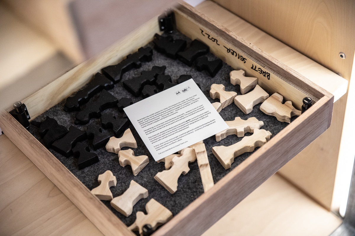This chess set, designed by Brett and produced by Proto, is a functional art object. It is meant to be used, to be touched, to be played with. Featuring an original drawing inscribed onto each box’s lid, the set moves between designations of utility and artwork with a simple reversal of the playing board.