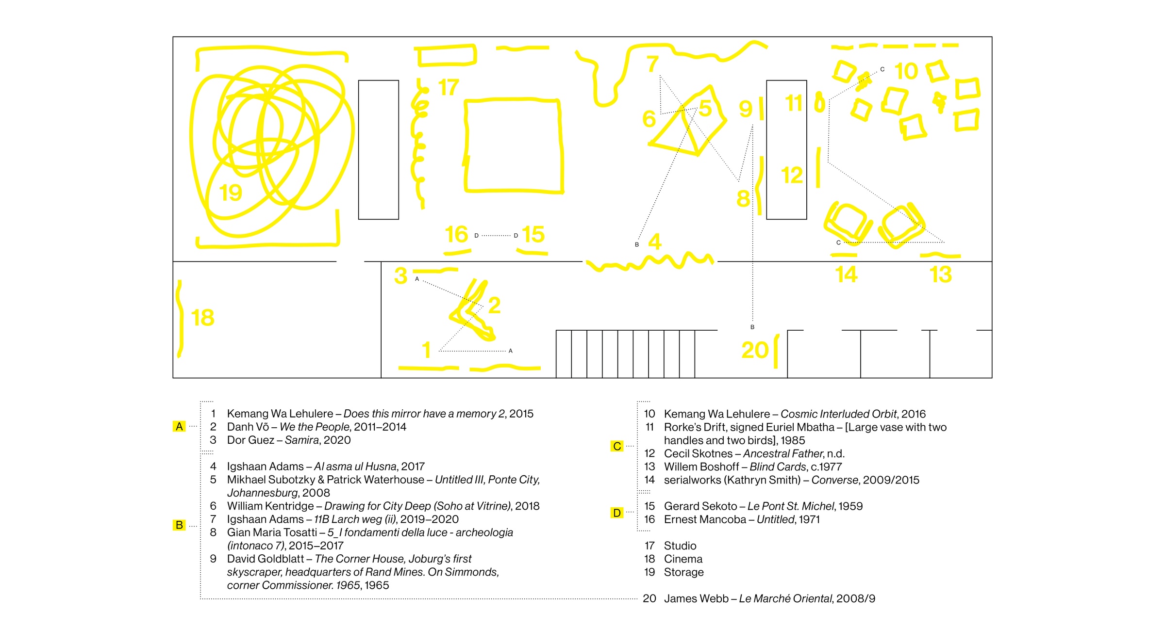 A phrase borrowed from the title of Kemang Wa Lehulere’s 2015 exhibition, which debuted at the National Arts Festival in Makhanda. Two of Wa Lehulere’s works, Does this mirror have a memory 2 (2015) and Cosmic Interluded Orbit (2016), are included in Sightlines.