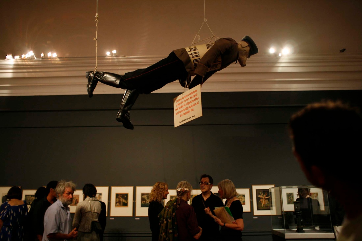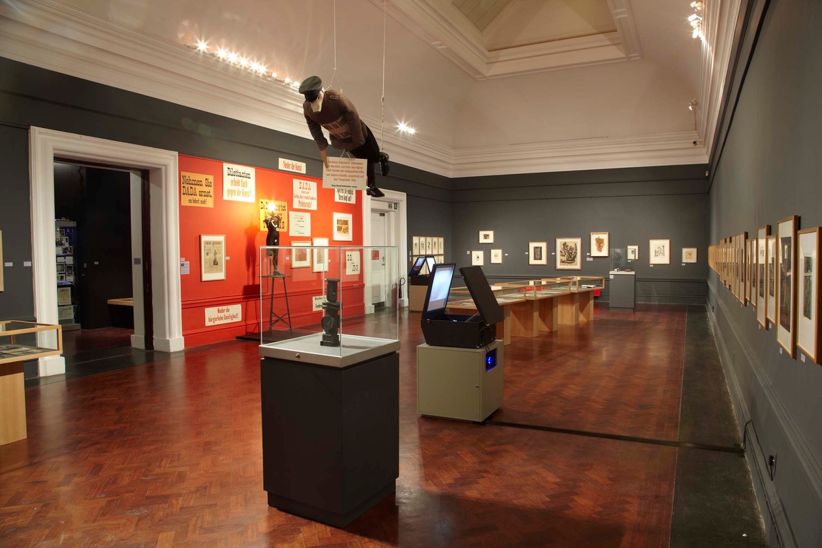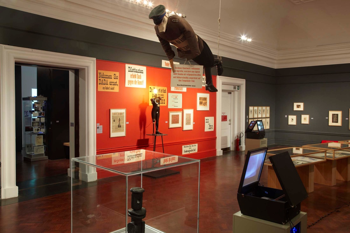 With Rudolph Schlichter, Heartfield constructs The Prussian Archangel (1920), a threatening figure suspended from the ceiling. Horrified by the various depictions of German authorities in compromising and unflattering positions, a colonel from the Reichswehr who visited the exhibition exclaimed, “You are all criminals and you ought to be shot!” The work was singled out as particularly offensive and the organisers of the exhibition subsequently faced prosecution. The sentence received was lenient, partly because the accused humbled themselves in their defence, promoting the socialist literary critic Kurt Tucholsky to comment that “the trial dilutes blood to lemonade. If Grosz didn’t mean it like that, we did.“