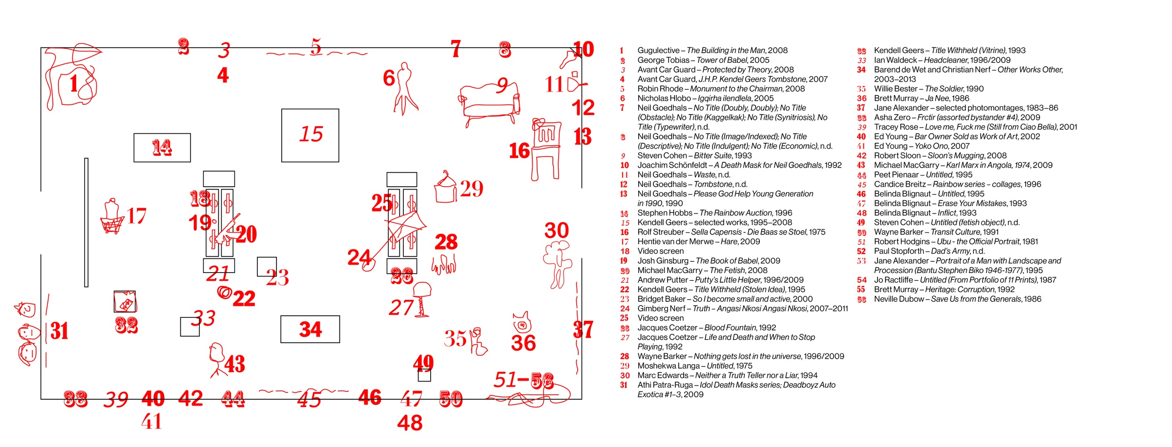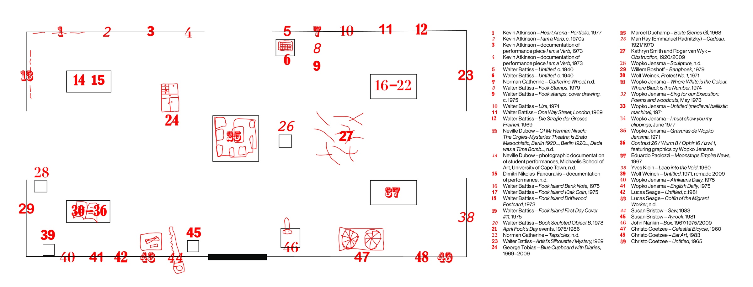 Jane Alexander, Siemon Allen, Hans Arp, AS IS, Kevin Atkinson, Avant Car Guard, Johannes Baader, Bridget Baker, Wayne Barker, Walter Battiss, Deborah Bell, Willie Bester, Belinda Blignaut, Erwin Blumenfeld, Dineo Seshee Bopape, Willem Boshoff, Candice Breitz, Susan Bristow, Brendon Bussy, Norman Catherine, Kathy Coates, Christo Coetzee, Jacques Coetzer, Steven Cohen, Barend de Wet, Aletta du Toit, Neville Dubow, Marcel Duchamp, Marc Edwards, Carl Einstein, Paul Éluard, Max Ernst, flatinternational, Kendell Geers, Josh Ginsburg, Neil Goedhals, George Grosz, Gugulective, Stacy Hardy, Raoul Hausmann, John Heartfield, Emmy Hennings, Matthew Hindley, Nicholas Hlobo, Stephen Hobbs, Hannah Höch, Robert Hodgins, Richard Huelsenbeck, Marcel Janco, Wopko Jensma, William Kentridge, Lisbeth Kkwadi, Yves Klein, Greta Knutson-Tzara, Adrian P Kohler, KOOS, Donna Kukama, Andrew Lamprecht, Moshekwa Langa, Andre Laubscher, Fernand Léger, El Lissitzky, Michael MacGarry, Ashnath Makubila, Sanna Mokgaha, Brett Murray, John Nankin, François Naudé, Gimberg Nerf, Christian Nerf, Dimitri Nikolas-Fanourakis, Eduardo Paolozzi, Cate Paputla, David Paton, Malcolm Payne, Francis Picabia, Peet Pienaar, Possession Arts, Chris Pretorius, Andrew Putter, Jo Ractliffe, Lesego Rampolokeng, Man Ray, Julia Raynham, Robin Rhode, Hans Richter, Julia Rosa Clark, Tracey Rose, Athi-Patra Ruga, Ruth Sacks, Rudolf Schlichter, Joachim Schönfeldt, Kurt Schwitters, Lucas Seage, Rosemarie Shakinovsky, Robert Sloon, Warrick Sony, Nathaniel Stern, Paul Stopforth, Rolf Streuber, Sophie Taeuber-Arp, Johan Thom, George Tobias, Tristan Tzara, Chaz Unwin, Hentie van der Merwe, Theo van Doesburg, Kemang Wa Lehulere, Ian Waldeck, Wolf Weinek, Robert Weinek, Emmett Williams, Ed Young, Asha Zero.