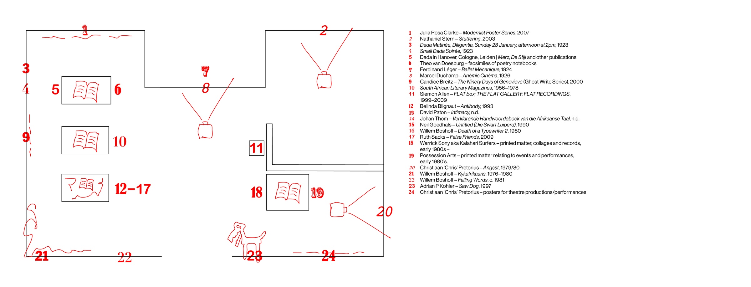 A week-long intensive in the Reading Room sees curators Kathryn Smith and Roger van Wyk unpack an archive of material accumulated during the research and design of Dada South? Experimentation, Radicalism and Resistance, an exhibition that was held at Iziko South African National Gallery, December 12, 2009–February 28, 2010.