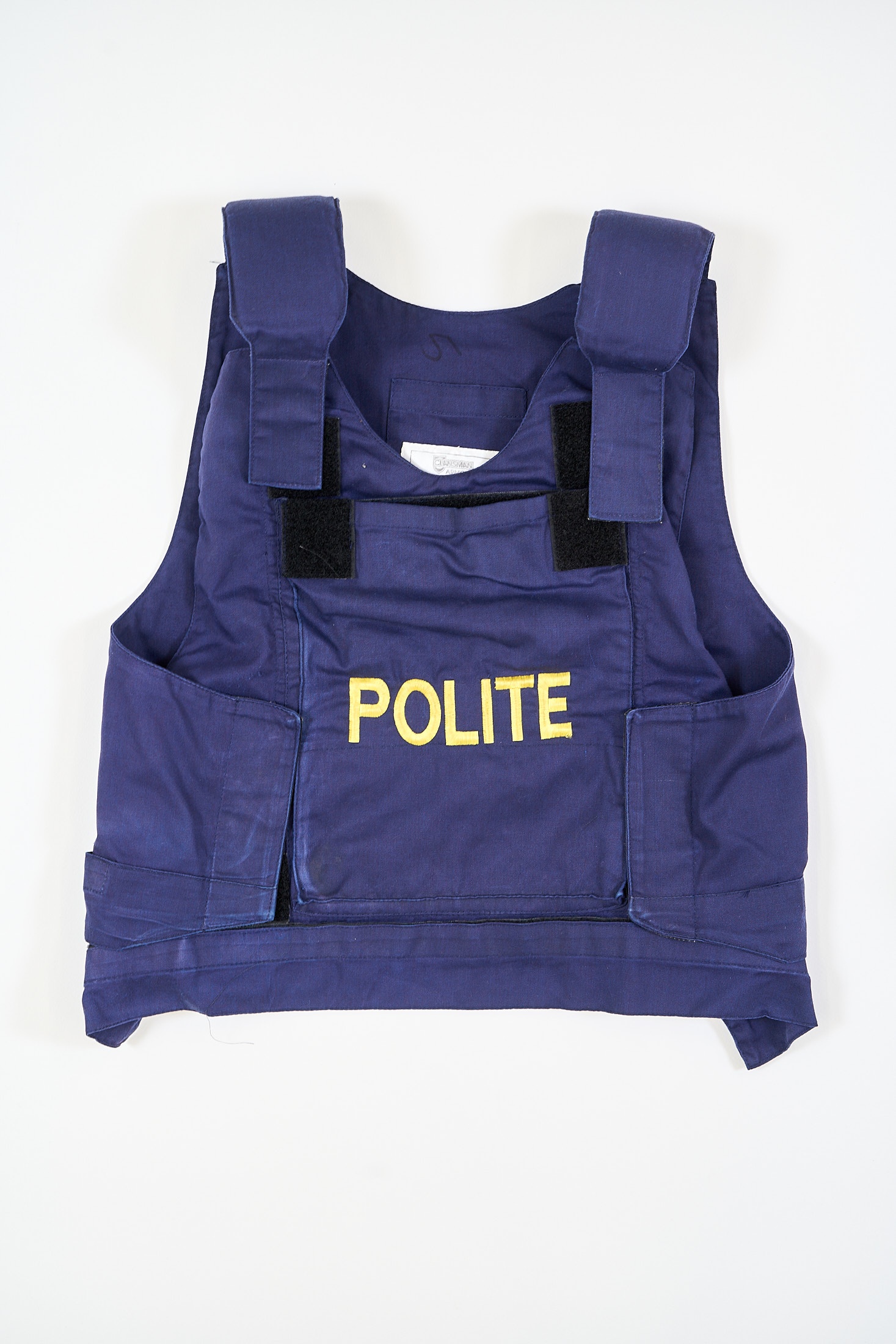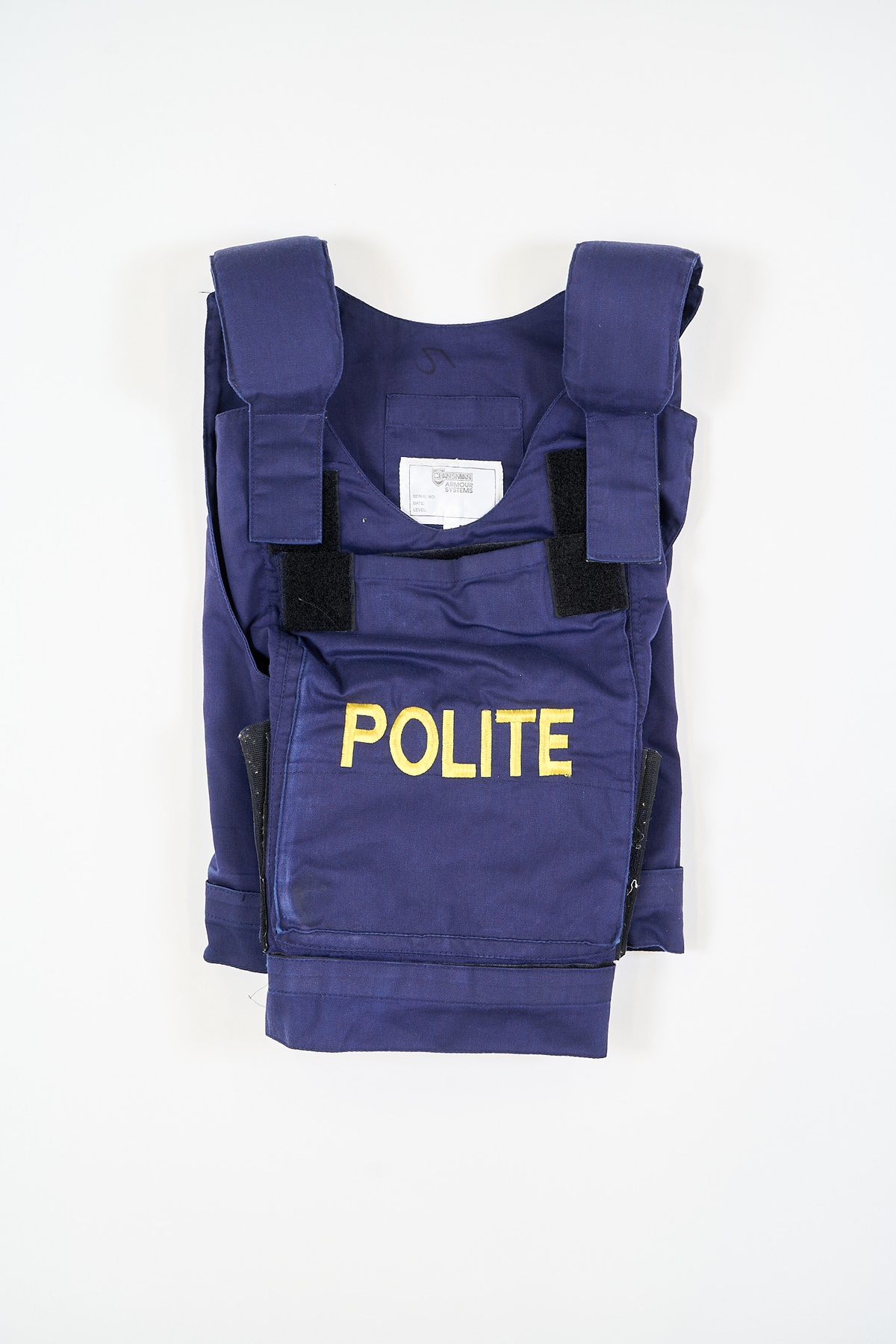 Original Polite Force vests produced for the first performance of the artwork on September 11, 2002. Constructed out of repurposed South African Police Force issue bulletproof vests, some still bore the names of the police officers who had worn them. Before 1994, it was not obligatory for police to be visible; the vests were not inscribed with ‘Police’. The original vests were worn in performances in Johannesburg, New York, and loaned to friends of the artist. A later set of vests was produced for the artist Dan Halter.