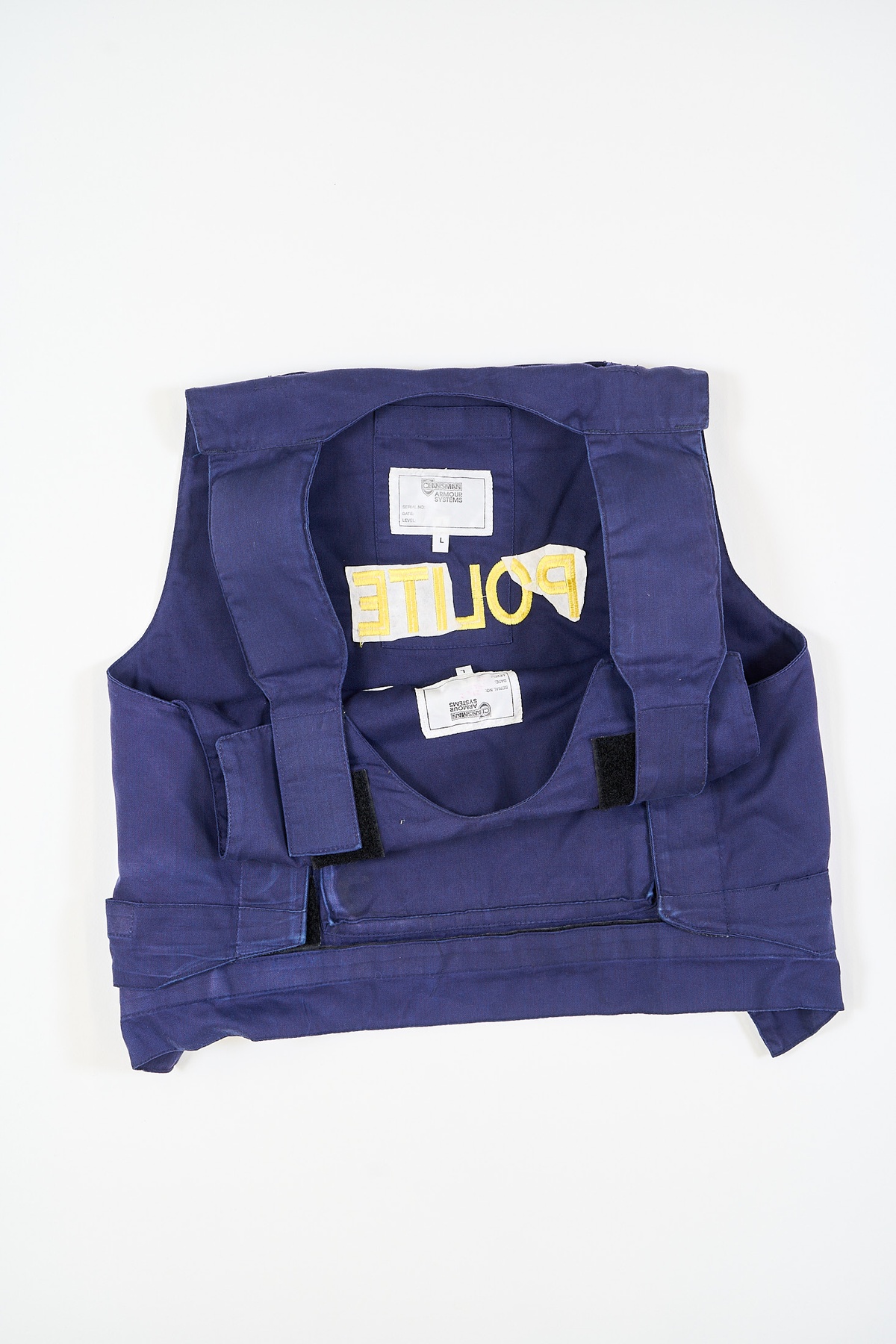 Original Polite Force vests produced for the first performance of the artwork on September 11, 2002. Constructed out of repurposed South African Police Force issue bulletproof vests, some still bore the names of the police officers who had worn them. Before 1994, it was not obligatory for police to be visible; the vests were not inscribed with ‘Police’. The original vests were worn in performances in Johannesburg, New York, and loaned to friends of the artist. A later set of vests was produced for the artist Dan Halter.