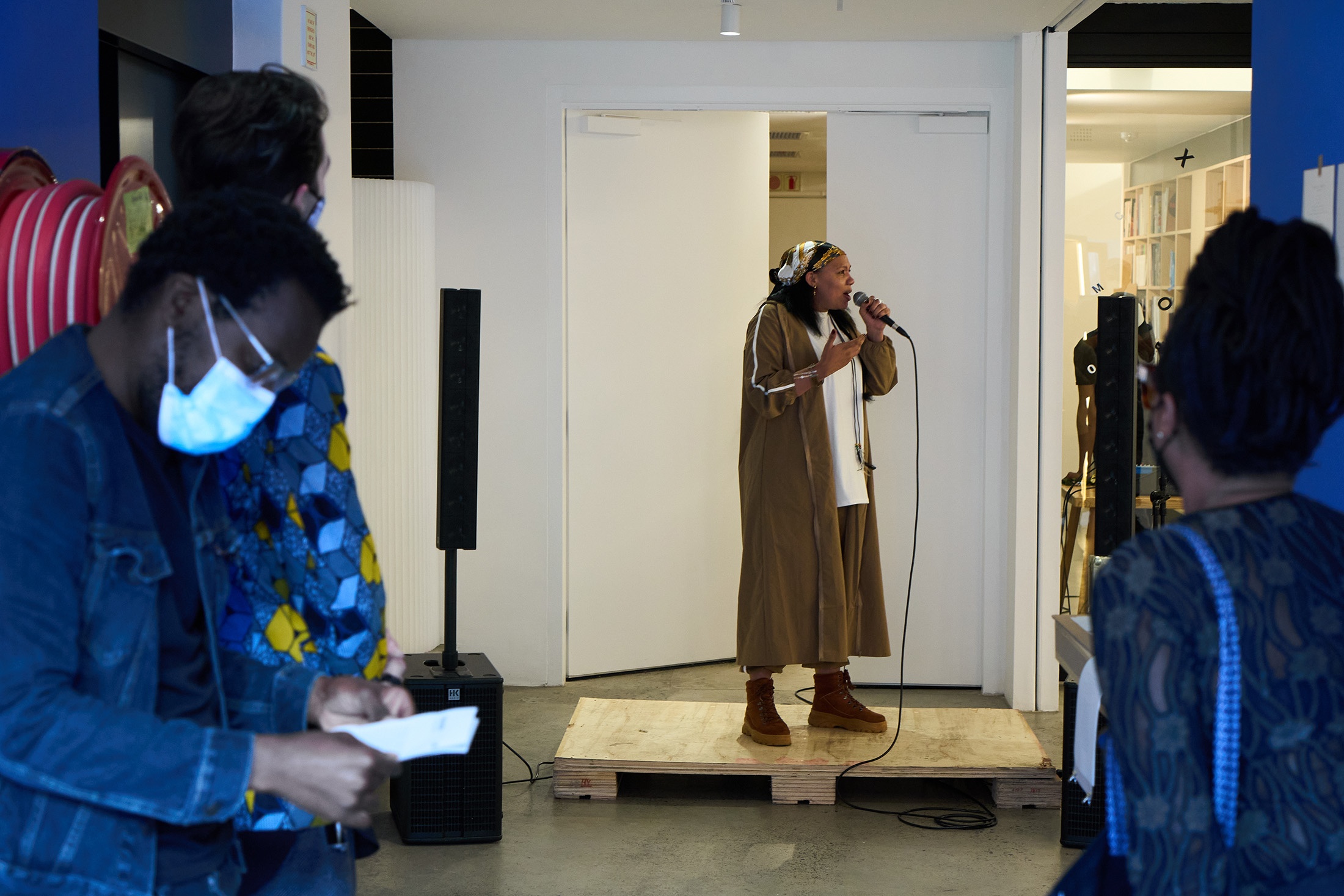 Umcimbi, the debut engagement in Goods, featured printed texts, audio recordings and a live performances of poems from Kaapstad, an anthology published by the advocacy group Back 2 School. Copies of the publication were available to purchase at the opening event, each covered in brown paper with the invitation to draw a unique cover.