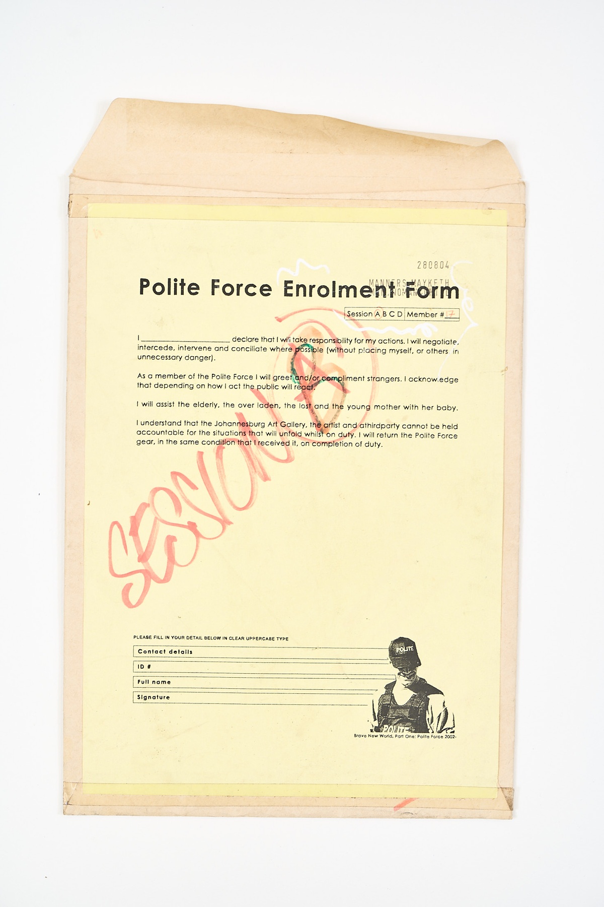 Polite Force enrolment form declaring the artist’s expectations of participants. Produced alongside the Johannesburg Art Gallery, where security wore Polite Force gear for some months.