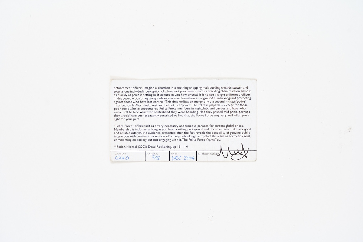 Members of the public who performed in Polite Force would take their caps home afterwards, along with this signed certificate, which features a text written by Kathryn Smith.