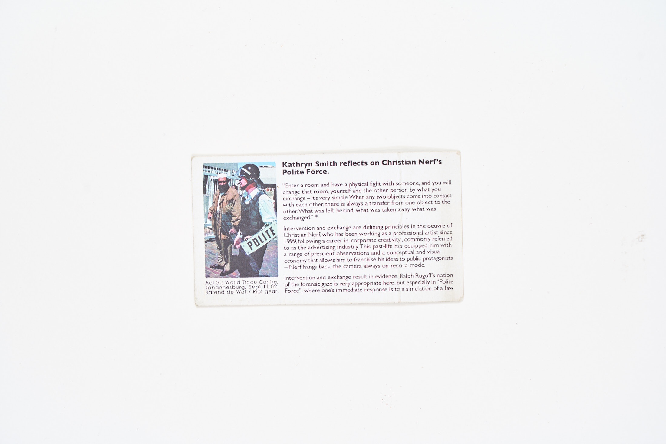 Ephemera: Unpacking Christian Nerf’s Polite Force, December 21–22, 2021. Image courtesy of A4 Arts Foundation.