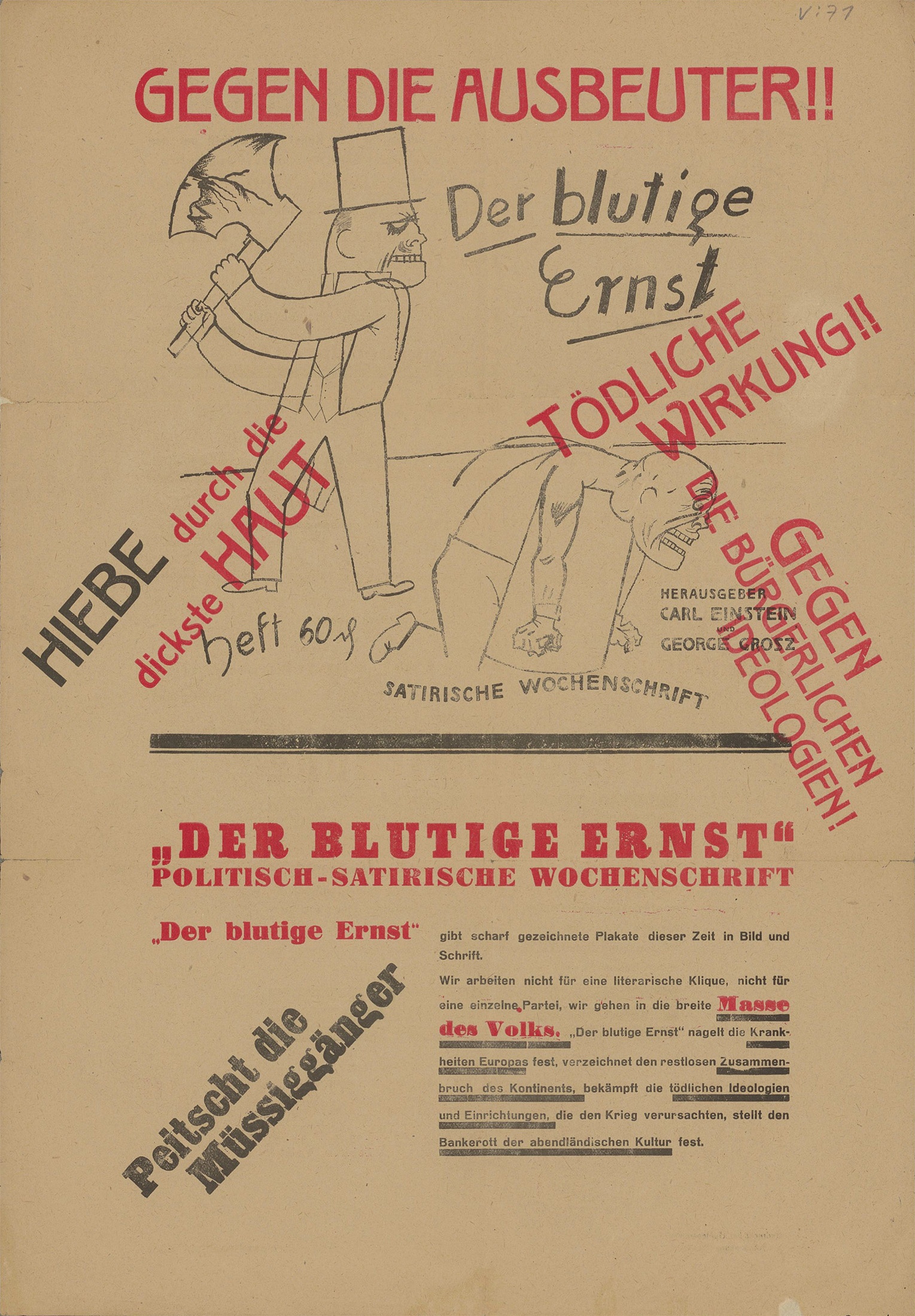 Poster (facsimile): George Grosz, Der blutige Ernst / The Bloody Truth: Politisch-satirische Wochenschrift / Political-Satirical Poster (1919). Brochure for the magazine Der blutige Ernst / The Bloody Truth, edited by Grosz and Carl Einstein. 39.8 x 27.9 cm. Courtesy of Berlinische Galerie, Landesmuseum fϋr Moderne.