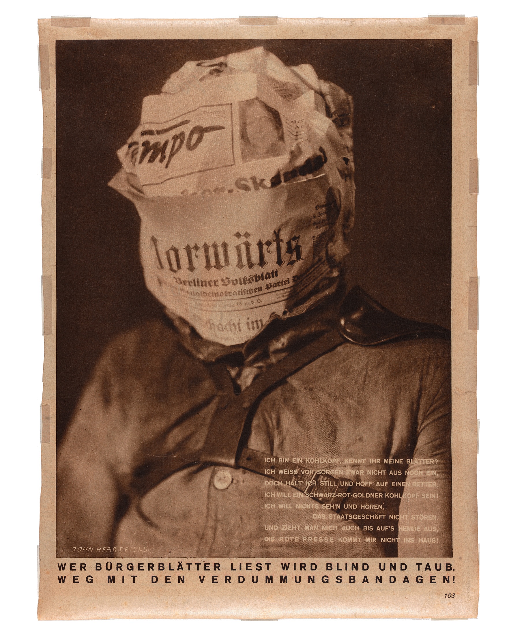 Poster: John Heartfield, Wer Bürgerblätter liest wird blind und taub / Whoever reads bourgeois newspapers becomes blind and deaf – Weg mit den Verdummungsbandagen! / Away with the stultifying bandages! (1930). Photomontage. Originally published in Arbeiter llustrierte Zeitung, Jg. 9, No. 6. 38 x 27.5 cm. Courtesy of Akademie der Künste, Berlin, Kunstsammlung.