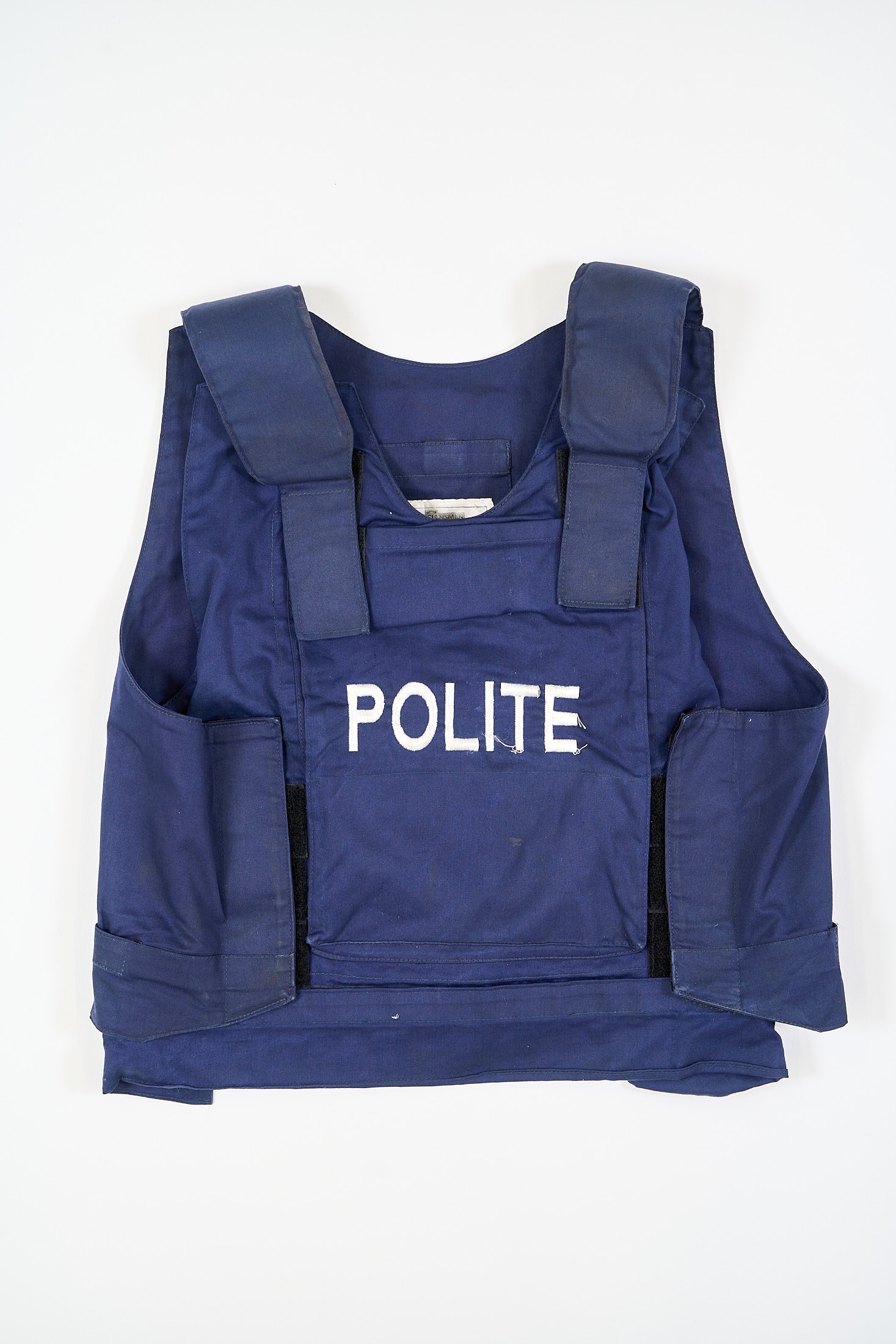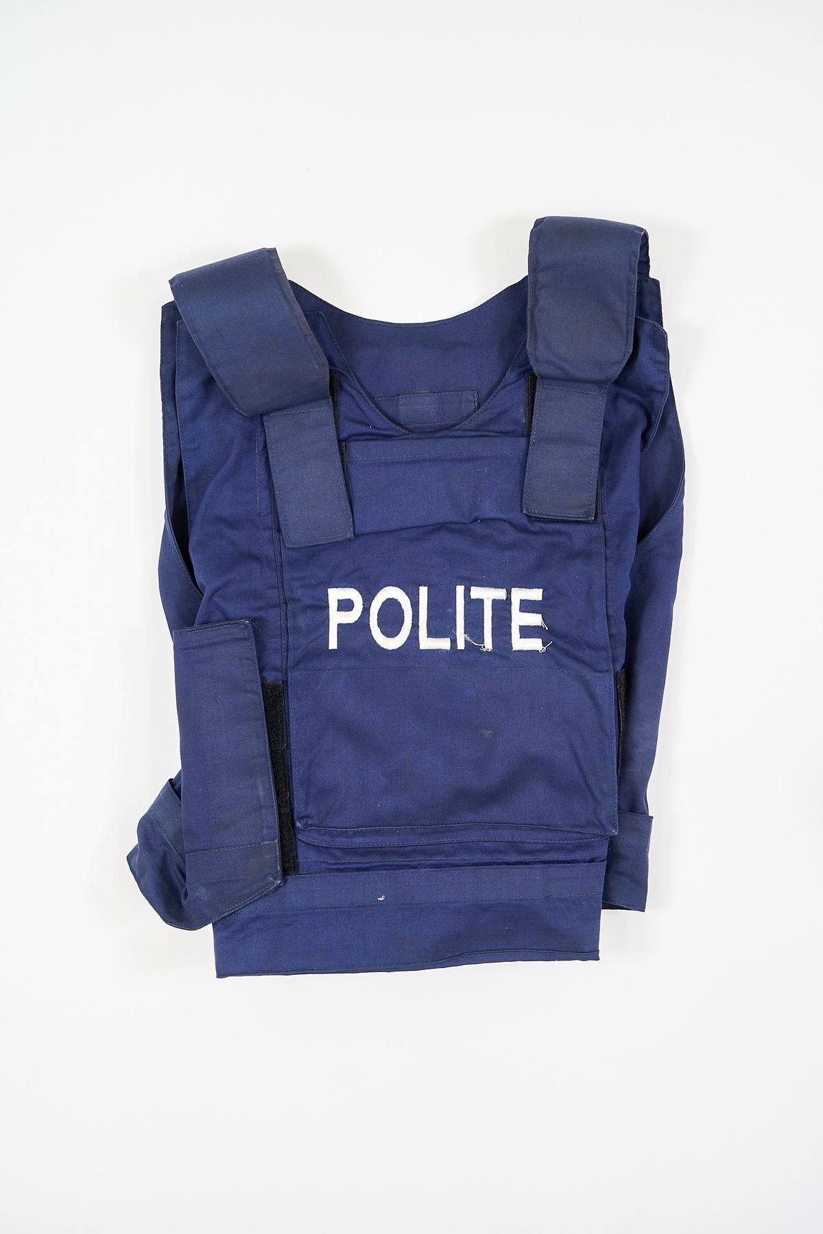 Original Polite Force vests produced for the first performance of the artwork on September 11, 2002. Constructed out of repurposed South African Police Force issue bulletproof vests, some still bore the names of the police officers who had worn them. Before 1994, it was not obligatory for police to be visible; the vests were not inscribed with ‘Police’. The original vests were worn in performances in Johannesburg, New York, and loaned to friends of the artist. A later set of vests was produced for the artist Dan Halter.