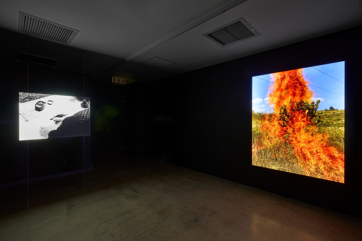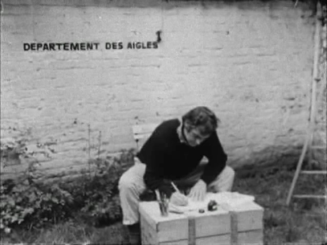Artwork: Marcel Broodthaers, La Pluie (projet pour un texte) (1969). Single-channel video transferred from 16 mm film (black-and-white, silent). 2 min. Artwork © and loaned courtesy of Estate Marcel Broodthaers. Image © A4 Arts Foundation.
