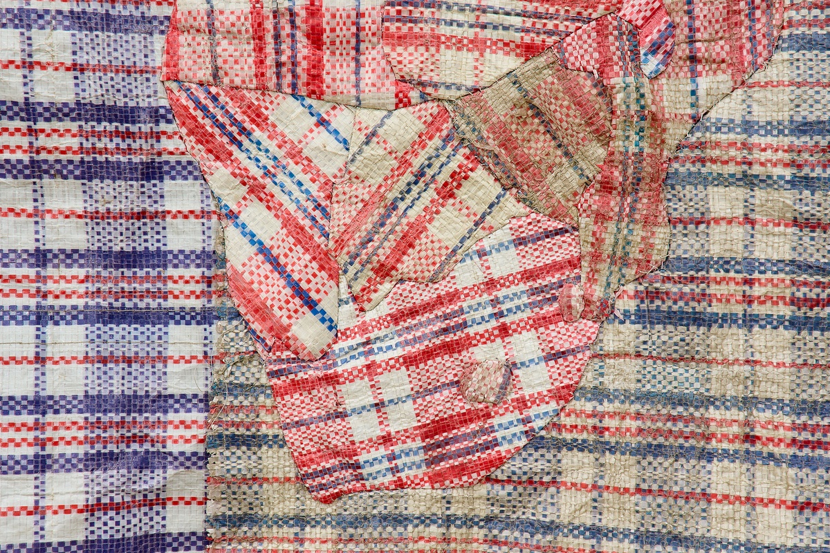 Cartography sits on an axis of pictorial representation and geometric abstraction. For Dan Halter, who brings the ‘red-white-blue’ bag into the dialogue, the map has been a tool to talk about migration, national identity and geopolitical power. Its fabric was originally invented as a tarp for construction sites, agricultural structures and temporary shelter in Japan. It was first transformed into a light-weight tote in the 1960s by a tailor in Hong Kong, but quickly became synonymous with the aesthetic language of border-crossing. In Nigeria, the bag is known as the ‘Ghana Must Go bag’, in South Africa, the ‘Zimbabwe bag’, in Germany, ‘Tuekenkoffer’ (Turkish suitcase), and in Guyana, the ‘Guyanese Samsonite’ – each name referencing complex geopolitical situations in each location.