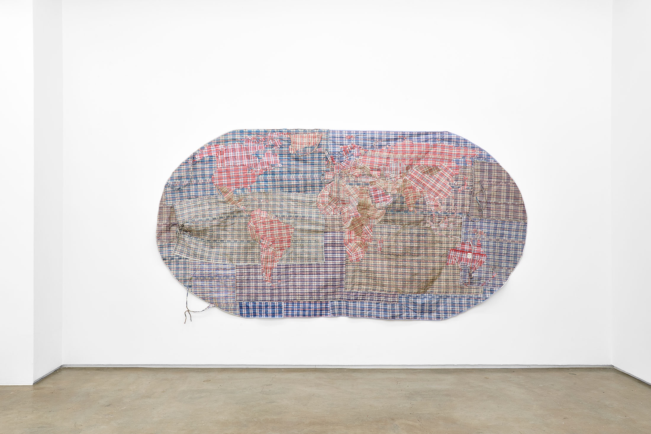 To use this bag as a material signals Halter’s contemplation over borders, especially the Zimbabwean-South African border, in relation to his own nationality. He drives this further by including fabric of varying condition in the work – some pieces are tattered, some in mint condition – to indicate areas of high emigration (used bags for Syria, Mexico, the DRC amongst others) and high immigration (new bags for Australia, the US, France amongst others). Creating a large-scale map that is the sum of many parts, Halter worked with Sibongile Chinjonjo, a Zimbabwean seamstress and refugee living in South Africa, to stitch Rifugiato Mappa del Mondo (2013) together.