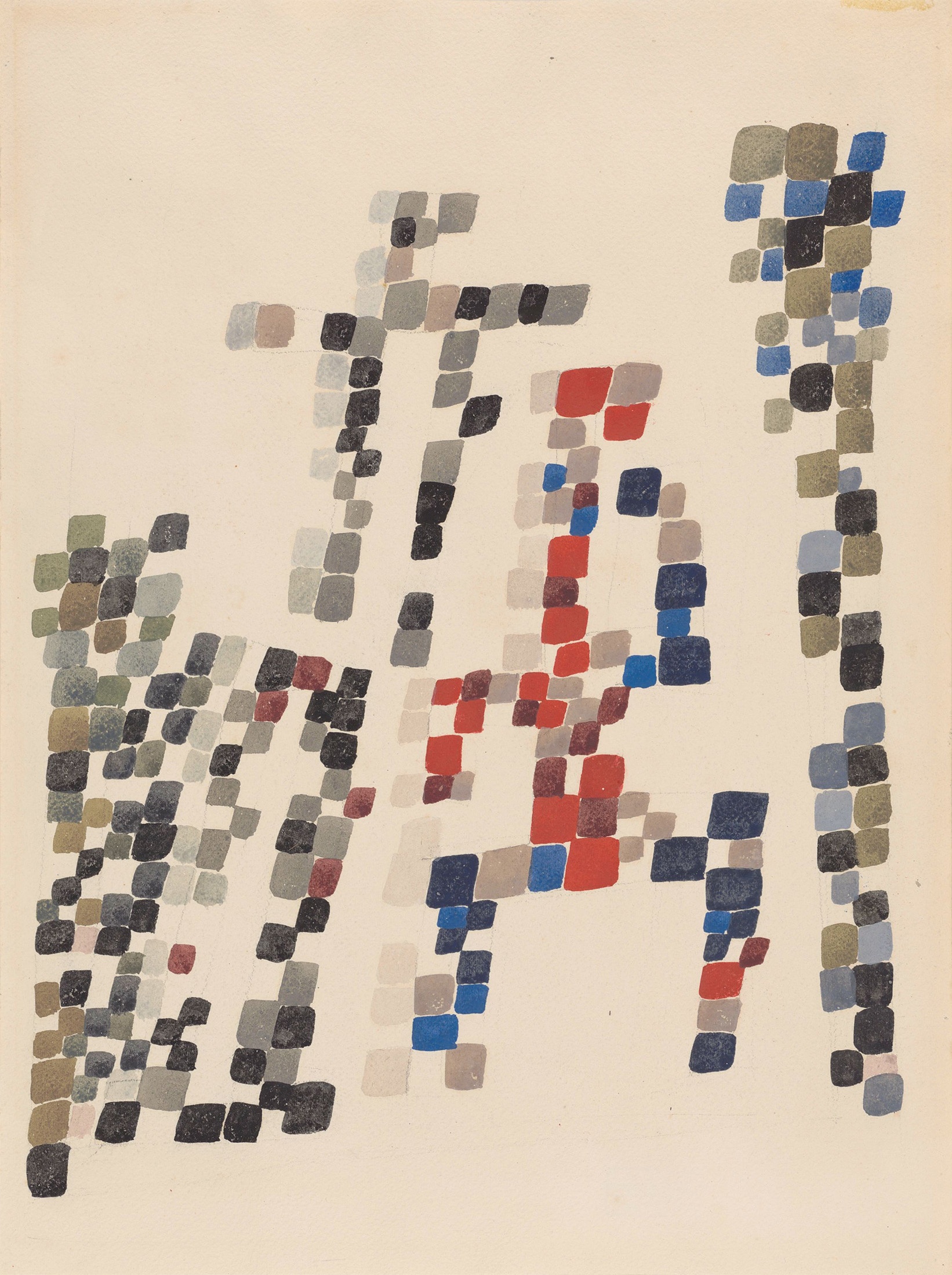Artwork: Sophie Taeuber-Arp, Quadrangular Splash, evocative of a group of people (1920). Aquarelle and gouache on vellum paper. 38.7 x 29 cm. Artwork courtesy of Kunsthaus Zϋrich, Grafische Sammlung.