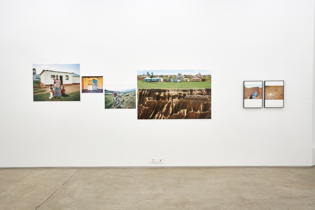 Lindokuhle Sobekwa's photograph 'Ezindongeni zase Kwezane' shows a settlement of houses in grassy field at the back, and eroded earth at the front.