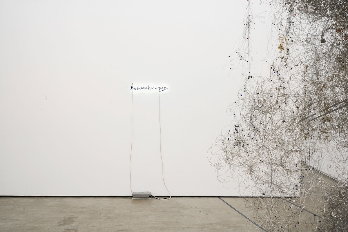 Taken from a series of neon lights, each bearing the same inscription written in different hands, Remember Me is a monument without referent. Drafted by the artist, his friends and acquaintances, the phrase appears differently charged, changed by the inflexion the respective letterings lend it. Each writer is rendered anonymous, the ‘me’ that asks for remembrance indistinct from every other. In some instances, the request – the demand, the desire – appears near-illegible, scrawled with apparent hurry; in others, it is carefully transcribed, written with slow precision. The phrases, translated in neon, glow darkly – the exposed side of the tubing obscured by paint, that the words might appear at once shadowed and illuminated. Without certain provenance, the repeated refrain becomes both a memento mori and a luminescent reflection on the living’s duty to the dead.